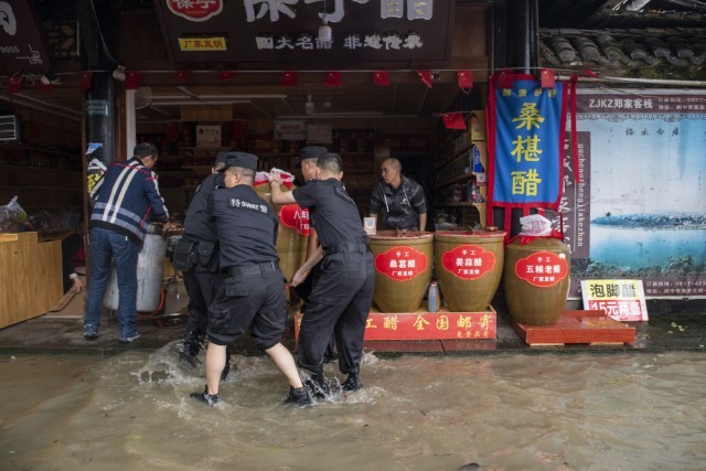 ↑ 在四川省阆中市,嘉陵江水漫进阆中古城内多条街道,公安民警帮助商户转运物资(2021年10月5日)。
