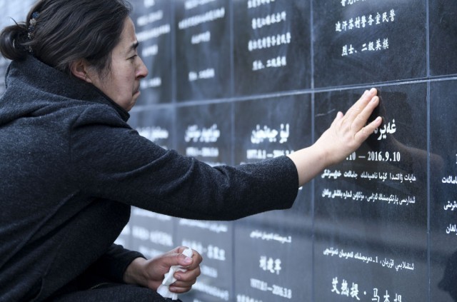 ↑在乌鲁木齐市革命烈士陵园,“人民英雄”艾热提·马木提的遗孀玛依努尔·尼扎木丁抚摸镌刻在新疆公安英烈纪念碑上艾热提的名字。(2021年4月3日摄)。