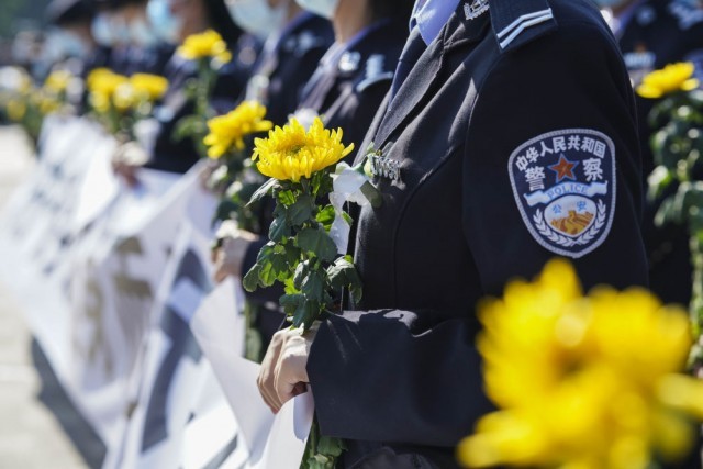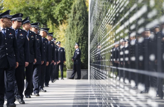 ↑ 在新疆公安英烈纪念园,新疆维吾尔自治区公安厅民警代表在祭奠英烈(2021年9月30日摄)。