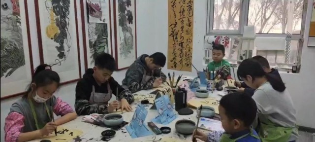 在银川市一家书画院,孩子们正在学写毛笔字和学画国画。(受访者供图)