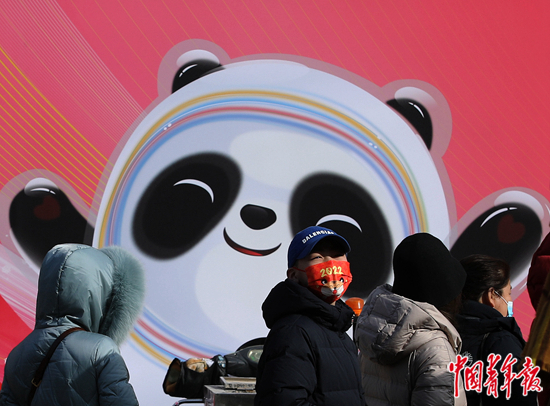 2月6日,北京王府井商业街,一名男孩在排队等待购买“冰墩墩”“雪容融”等纪念品。近日,北京冬奥会的开幕带动冬奥周边纪念品的热销,“冰墩墩”形象的纪念品在不少网络销售平台售罄,出现“一‘墩’难求”的现象。中青报·中青网记者 陈剑/摄