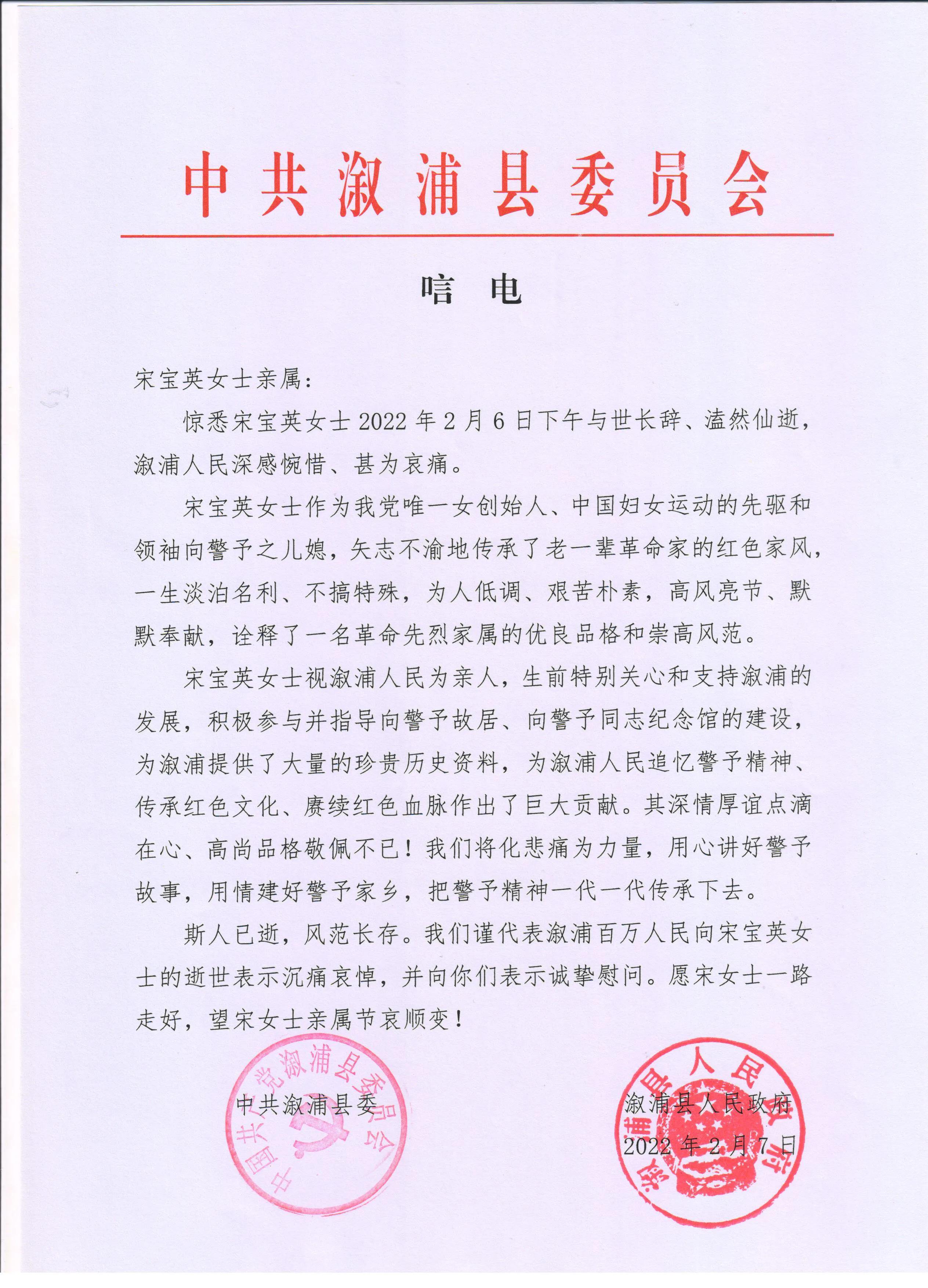 向警予家乡溆浦唁电中说,“宋宝英女士作为我党唯一女创始人、中国妇女运动的先驱和领袖向警予之儿媳,矢志不渝地传承了老一辈革命家的红色家风一生淡泊名利、不搞特殊,为人低调、艰苦朴素,高风亮节、默默奉献,诠释了一名革命先烈家属的优良品格和崇高风范。”