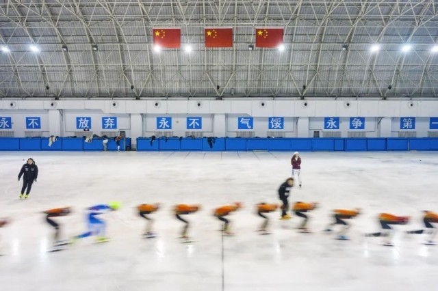 在七台河体育中心,七台河职业学院短道速滑训练中心的孩子们在进行训练(1月10日摄)。新华社记者 张涛 摄