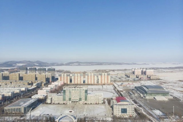 1月12日拍摄的七台河职业学院校园和七台河体育中心(右侧建筑)外景(无人机照片)。新华社记者 张涛 摄