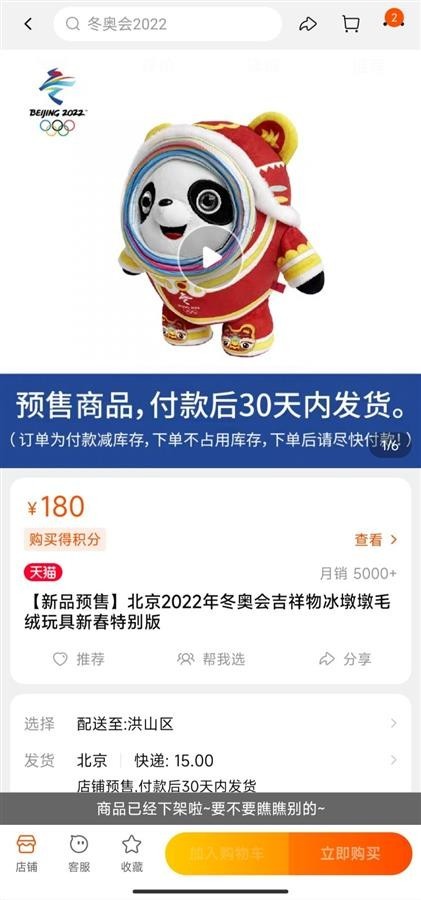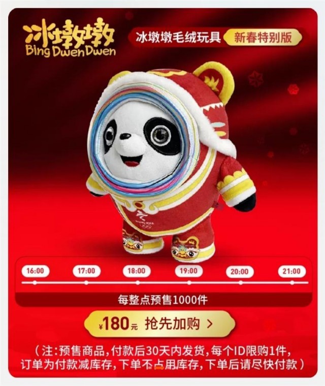 为了增强春节喜庆的氛围,冰墩墩毛绒玩具新春特别版于9日下午4点在天猫奥林匹克官方旗舰店开启预售,一直到9日晚9点,每个整点各预售1000件,该款商品将在付款后30天内发货,每个账号限购1件。但极目新闻记者注意到,在每个整点开启的预售中,不到3秒,新春特别版冰墩墩即被网友“秒光”。