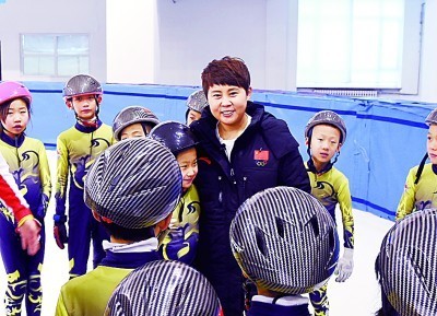 与家乡短道速滑小队员在一起的王濛。秦存广摄