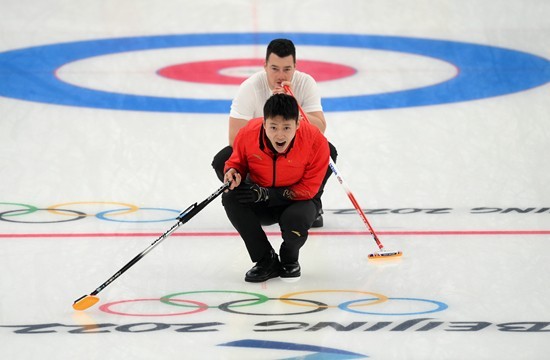 2月13日,中国男子冰壶队以6∶7不敌英国队,马秀玥在比赛中。 视觉中国供图