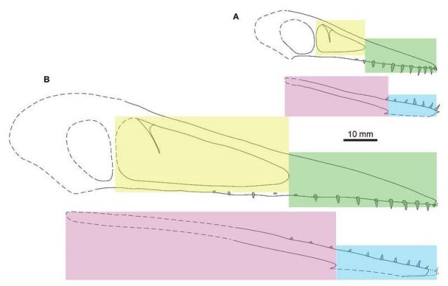 中国鲲鹏翼龙幼年和成年头骨比较,显示大小接近的牙齿。中科院古脊椎所供图