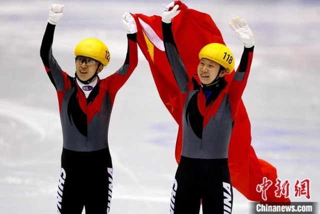 2002年2月16日,美国盐湖城,2002盐湖城冬奥会短道速滑女子500米决赛,杨扬(左)夺得冠军。为中国代表团实现冬奥会金牌“零的突破”。 图片来源:视觉中国