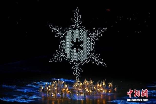 伴随主题歌《雪花》的温暖歌声,空中出现一个巨大的焰火光环,象征“世界大同,天下一家”的主题表达和“更团结”的奥林匹克精神,也为本届冬奥会画上一个成功圆满的句号。