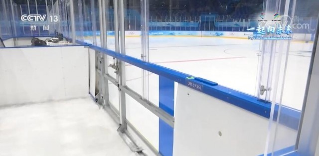 国家体育馆场馆运行团队媒体副主任 潘忠民:运动员时刻要关注场上的变化,一旦到换人的时候,他这冰橇打开就出去了,所以这个地方必须是做透明的。同时为了做得精细,就是里面的冰厚度跟这个(赛场上)冰面的厚度一样高,不影响他出去。