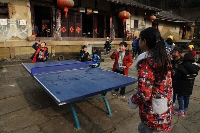 孩子们在吕家大院打乒乓球。中青报·中青网记者 王鑫昕/摄