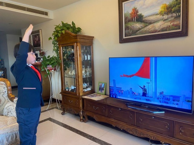 3月1日一大早,内蒙古自治区呼和浩特市苏虎街小学二年级一班学生刘思延穿好校服、戴上红领巾,站在家中电视机前,参加学校开学第一天的升国旗仪式。这是一次“线上”开学典礼,呼和浩特市中小学生在这一天都迎来了“线上”开学。