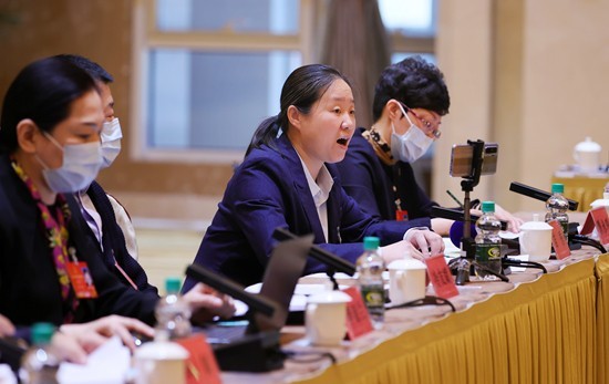 2022年3月6日,北京,十三届全国人大五次会议黑龙江代表团举行小组会议,分组审议政府工作报告。苗秀是一名来自生产一线的全国人大代表,她的发言是《关于进一步完善技能工人成长成才平台,提升技能稳就业》。人民视觉供图