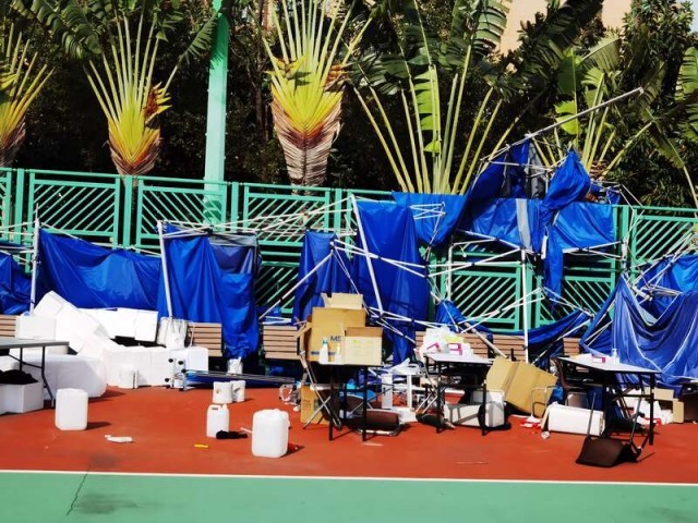 昨晚香港刮大风,把采样点临时搭建的二十几个整整齐齐的雨棚吹得帐篷顶布都没了,棚架折断,物资散落一地,地上到处是干枯的树叶和大风过后的沙粒。