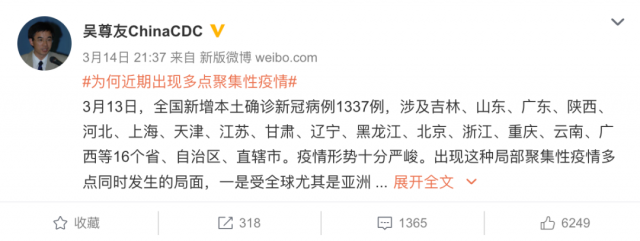 3月14日,中国疾控中心流行病学首席专家吴尊友发布微博,解析为何近期出现多点聚集性疫情,并对疫情形势作出最新判断。