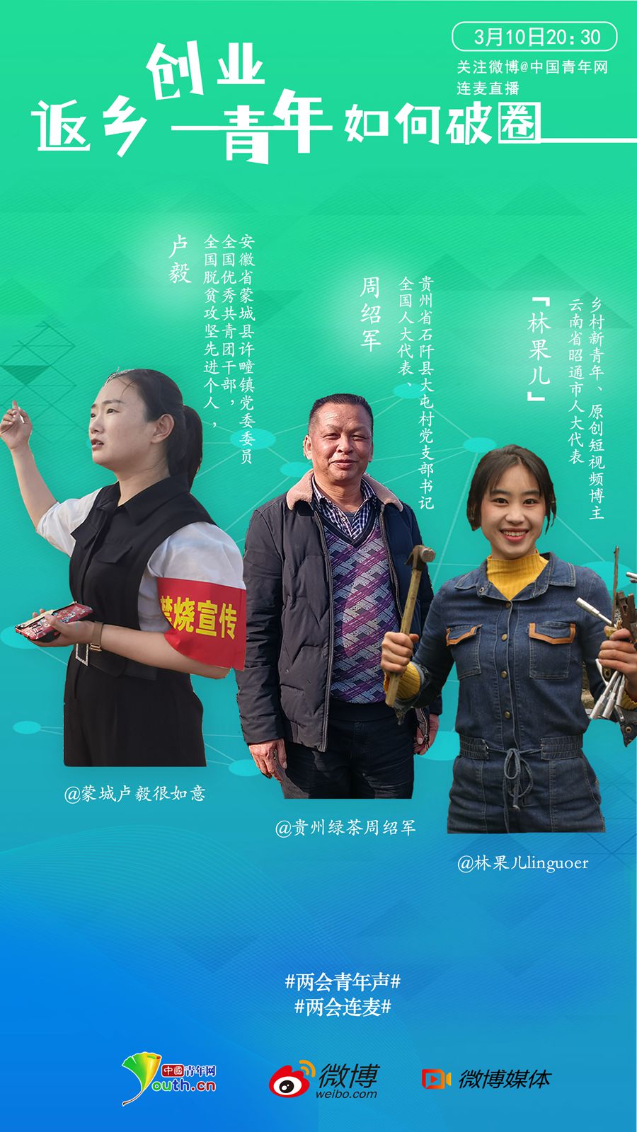 近日,中国青年网法人微博联合微博推出“两会青年声”直播连麦,邀请了全国人大代表、贵州省石阡县龙塘镇大屯村党支部书记周绍军,全国脱贫攻坚先进个人、全国优秀共青团干部、安徽省三八红旗手、安徽省蒙城县许疃镇土桥村党委委员卢毅,原创短视频博主@林果儿linguoer 作客直播间,分享返乡创业、回乡就业、服务创业的真实经历,讲解乡村人才振兴、产业振兴各项扶持政策等。