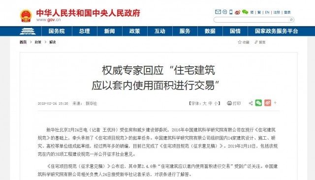 2019年的2月24日,新华社发布《权威专家回应“住宅建筑应以套内使用面积进行交易”》的文章,文中援引中国建筑科学研究院有限公司相关负责人的解释称:“住宅建筑应以套内使用面积进行交易”这一条款的提出,在规范起草过程中,对国际国内住宅面积计算做法进行调研,按套内使用面积计算是国际通行做法,而我国住宅面积计算方式主要采用建筑面积或套内建筑面积。
