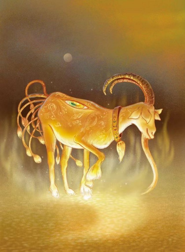 还有这只叫猼訑的神兽,它竟然在背上长了一只眼睛,陈丝雨绘制的这只眼睛实在迷人。由于猼訑有让人不生恐惧的特征,所以,柔弱的女孩子会把它的画像做成贴贴在胳膊上,让它做自己的保护神。背上有这样一只眼睛,谁还会恐惧暗箭伤人呢?
