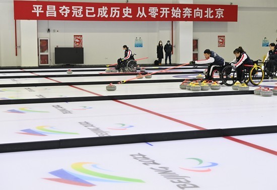 2021年11月,国家残疾人冰上运动比赛训练馆冰壶馆,轮椅冰壶队在训练。