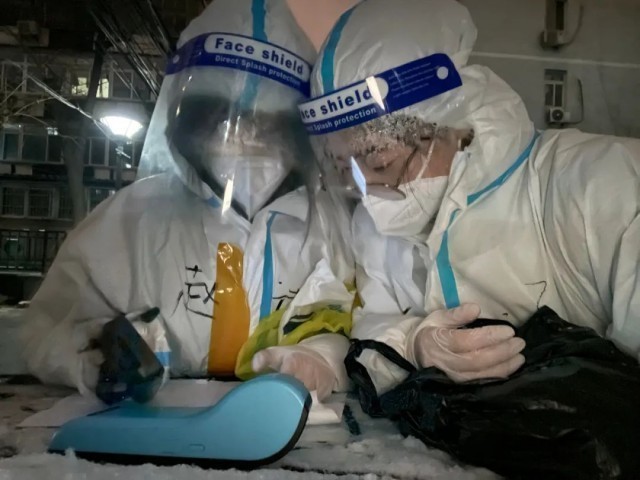 3月20日,崇外街道楼宇工作站工作人员李彦博进入国瑞城东区社区封控区服务,同在街道当社工的妻子忙完手上的工作,赶来给他送换洗衣服。封控区内,李彦博每天穿着防护服为400多户居民服务,一天送几百个快递,和医护人员一起挨家挨户上门测核酸,安抚居民的情绪。有时通宵不能合眼,有时一天不能按时吃饭。“忙起来就感觉不到累了。”李彦博说,党员就应该不怕苦,遇到危险冲在前面。