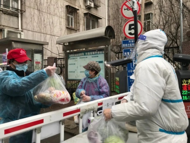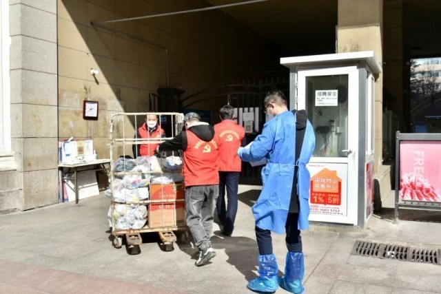 3月23日,在北小街3号院内,北新桥街道城市管理办公室科长闻超正在挨家挨户地为居民送去大米、鸡蛋、牛奶等生活必需品。