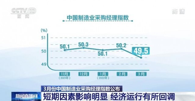 中国物流与采购联合会副会长 蔡进:3月份采购经理指数确实有一定幅度的回落,回落的因素还是短期因素为主导,主要还是全国多地散发的疫情影响比较大。现在来看采购经理指数在49.5%这么一个水平,虽然有回落,但是总体上也还是反映出来中国经济的抗压性还是比较强的。