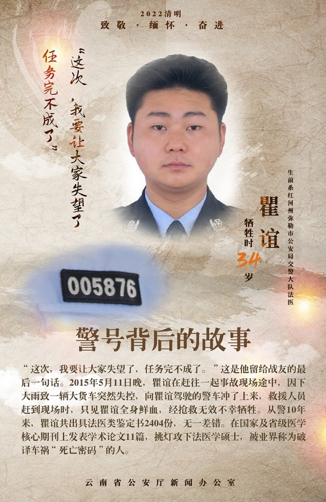 “这次,我要让大家失望了,任务完不成了。”这是他留给战友的最后一句话。2015年5月11日晚,瞿谊在赶往一起事故现场途中,因下大雨致一辆大货车突然失控,向瞿谊驾驶的警车冲了上来,救援人员赶到现场时,只见瞿谊全身鲜血,经抢救无效不幸牺牲。