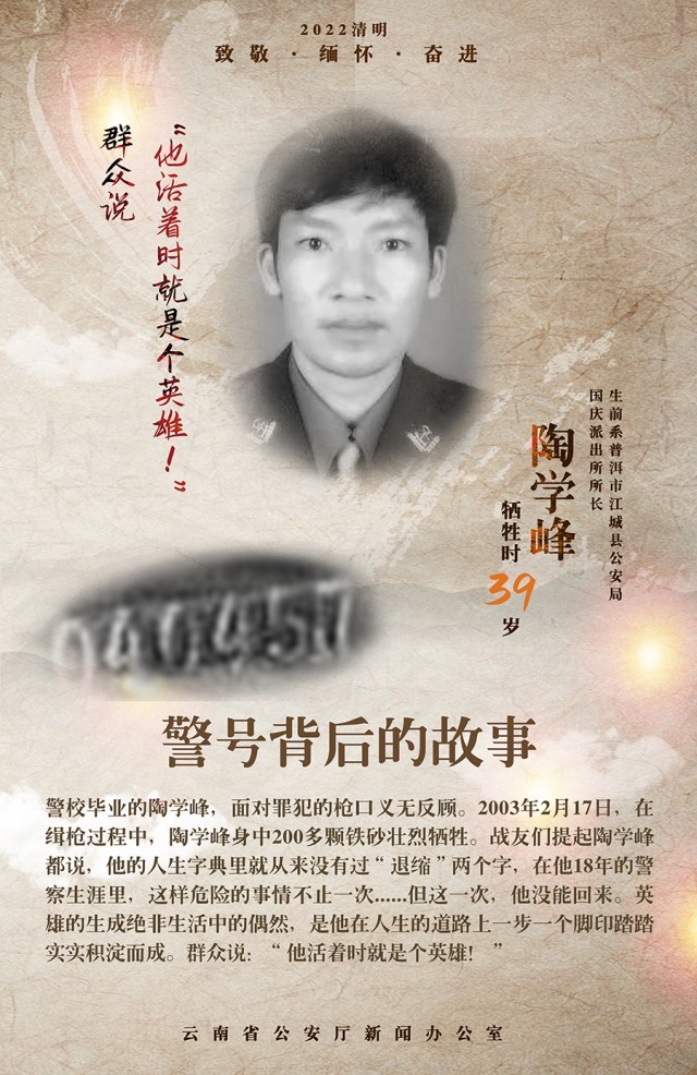 2003年2月17日,在缉枪过程中,陶学峰身中200多颗铁砂壮烈牺牲。战友们提起陶学峰都说,他的人生字典里就从来没有过“退缩”两个字,在他18年的警察生涯里,这样危险的事情不止一次……但这一次,他没能回来。