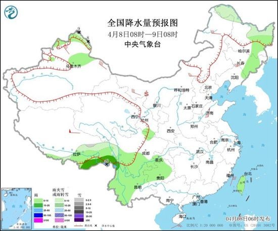 其中今天,降水区域主要集中在西南地区和东北地区等地,预计新疆北疆北部、西藏东北部、内蒙古东北部、黑龙江北部等地部分地区有小雪或雨夹雪,其中,北疆北部山区局地有大雪(5~9毫米)。东北地区东部、新疆北疆北部和沿天山地区、西藏东南部、四川南部、重庆西部、云南西部和北中部、贵州中西部、台湾岛等地部分地区有小到中雨,西藏东南部、云南西北部等地局地有大雨(25~40毫米)。