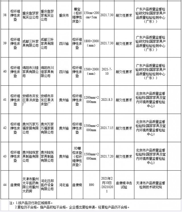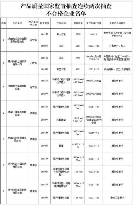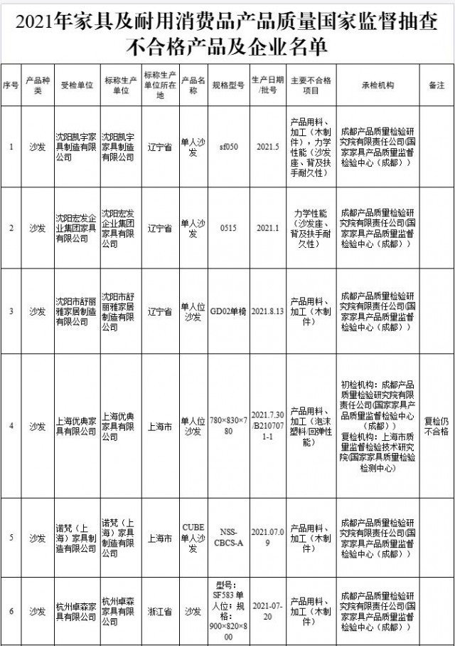 中新财经4月8日电 8日,国家市场监督管理总局通报了2021年家具及耐用消费品产品质量国家监督抽查情况,本次抽查了247家企业生产的248批次产品,涉及沙发、棕纤维弹性床垫、座便椅等3种产品,共发现44批次产品不合格,抽查不合格率为17.7%。有7家企业连续两次抽查不合格。