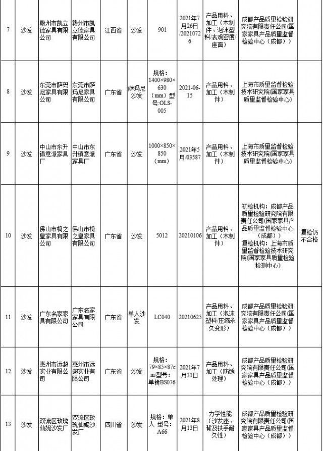 本次抽查重点对产品用料、加工,表面涂层理化性能,力学性能,安全性能等7个项目进行了检验。抽查发现的问题涉及产品用料、加工,力学性能等2个项目。经技术机构分析,上述项目不合格将会降低沙发的舒适度和使用寿命,不合格的主要原因是企业选用了低质的原材料。