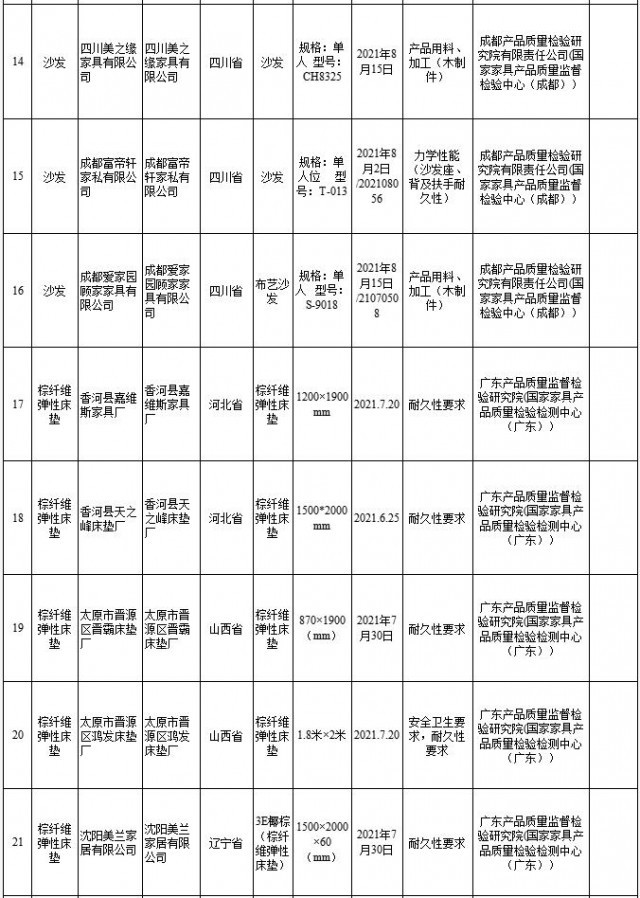 本次抽查重点对面料及复合面料物理性能(耐摩擦色牢度)、芯料物理性能、安全卫生要求、阻燃性要求、耐久性要求等5个项目进行了检验。不合格项目涉及安全卫生要求、耐久性要求。经技术机构分析,不合格的主要原因是企业对原材料把控不严,生产过程中使用的材料回弹性较差,缺乏对成品的必要检验等。