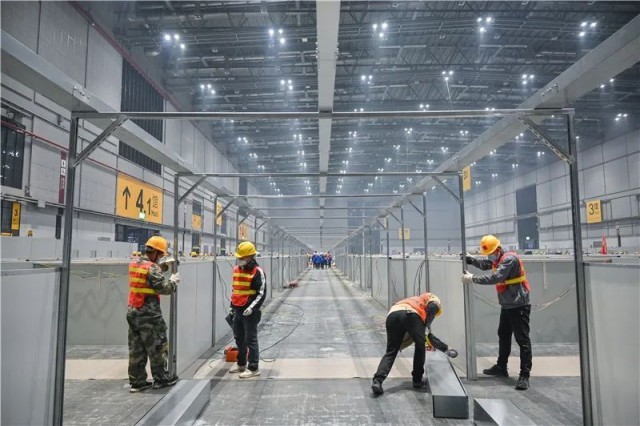 工人对6.1号馆进行改建,该馆预计可提供3433张床位。中建八局四公司供图