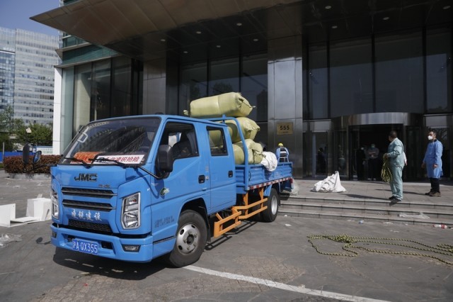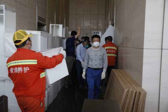 “嘿呦,嘿呦,加把劲哟!”瀛通大厦大堂前的广场上,阳光刺眼,空气灼人。床板、海绵、床头柜、被子等物资早已堆积成山,身穿蓝色简易防护服的工友们,正在挥汗如雨。“急人啊!把物资搬上楼,只能靠这6部电梯,蚂蚁搬家!”来自云南的林师傅,用发黄的毛巾抹了一把脸,“好困,一天一夜没睡了,再坚持下,今晚收工!”