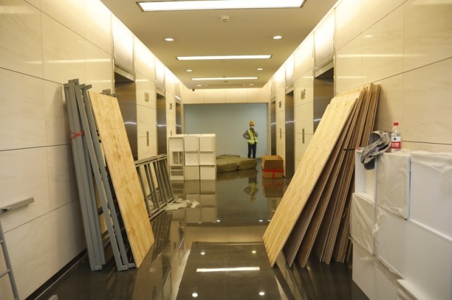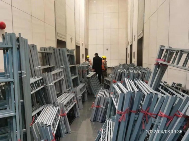 丁荣直言,为期4天的应急改造,最大的难题是垂直运输受到电梯运力限制:“其他方舱,物资运到基本可以迅速进场。这个方舱是在高层办公楼内,场地作业面狭小,外场医疗配套设施入场难度很大。大家就是‘螺蛳壳里做道场’,把所有物资逐层搬上楼,再改造整修,24小时不间断作业。”