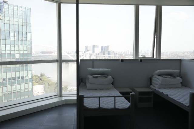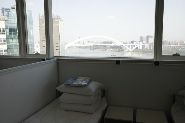 乘坐宽敞的大楼电梯,笔者和多名清洁工一起来到这家方舱医院的22楼。记者发现:可以欣赏优美黄浦江风景、配备免费WIFI、25张床位组成“小包间”,或是黄浦区开平路瀛通大厦方舱医院的“特色”。