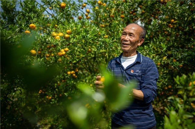 刘超仁在云南西畴县兴街镇江龙村查看待收获的柑橘(3月26日摄)。新华社记者 江文耀 摄
