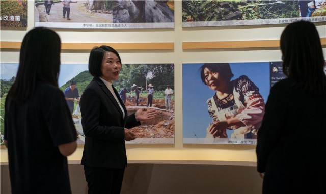谢成芬在西畴县“西畴精神”展览馆里讲述治理石漠的故事(3月26日摄)。新华社记者 江文耀 摄