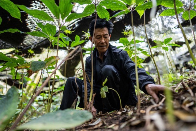 在云南西畴县西洒镇,程敦儒在中药材基地劳作(3月27日摄)。新华社记者 江文耀 摄