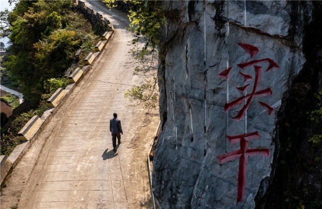 一条蜿蜒曲折的水泥路挂在山崖间、冲出乱石堆,还劈开一块十几米高的巨石,在岩壁上留下刷着红漆的两个大字——“实干”。