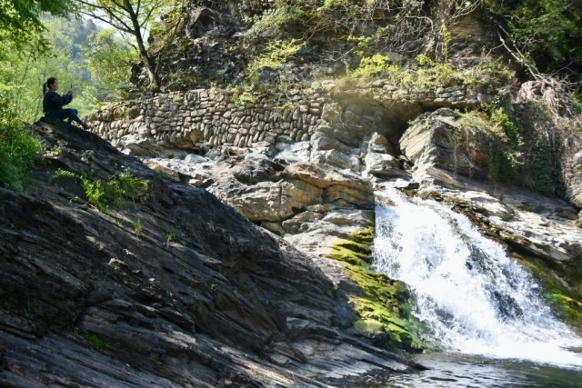 一名游人坐在汉水源村村口的瀑布旁观景。新华社记者郑昕摄