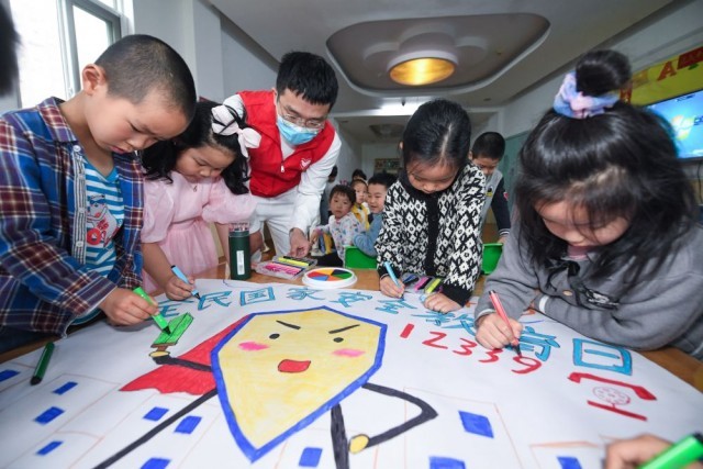 4月13日,龙泉街道日月城幼儿园的孩子在创作国家安全教育主题绘画。