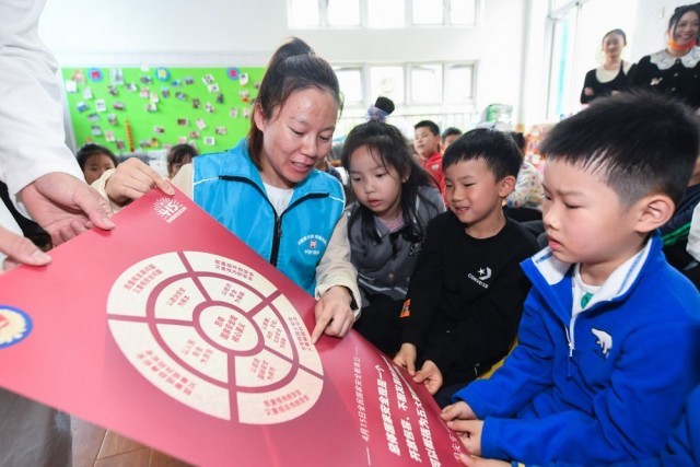 4月13日,在龙泉街道日月城幼儿园,社区志愿者给孩子们介绍全民国家安全日相关知识。