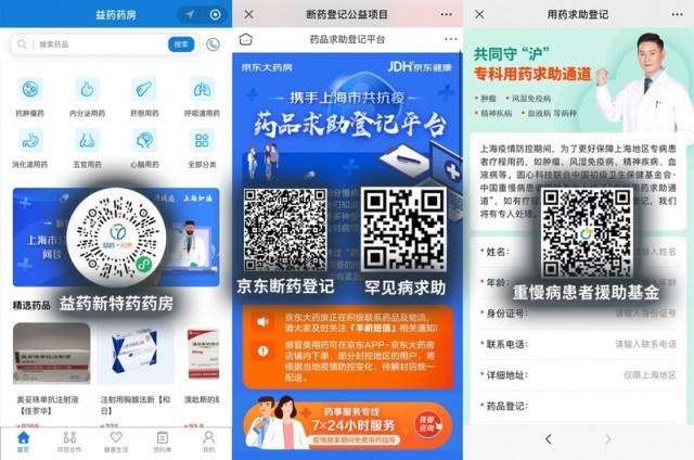 此外,对于一些重疾病的处方药,普通药店没有库存,患者可选择在“益药·新特药”小程序上购买。益药小程序是上药云健康开发的云药房,疫情期间,特别推出了新特药和慢性药的保供服务。对于如肿瘤靶向药、自身免疫疾病、罕见病、重大慢性疾病等患者的新特药用药,患者需上传处方,经药师审方之后,即可预约购药。另外,京东健康、中国重慢病患者援助基金会等也都开通了药品求助登记渠道,有药品急需者可在平台登记,等待回访。