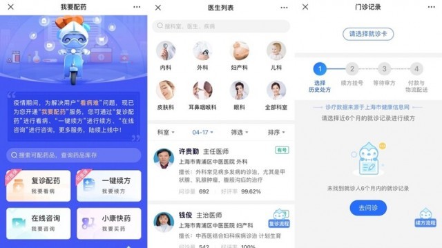 如果市民急需某种药品,可在最上方的搜索框里查询该药品,并根据是否有库存来决定是否继续就诊。如果患者需要先复诊病情再配药,可点击“复诊配药”,在医生列表中寻找对应科室的医生,填入您此前的就诊信息,即可预约在线就诊。如果是普通慢性病配药,还可点击更方便的“一键续方”,绑定自己的社保、医保就诊卡后,系统即会提供该账户下近6个月的就诊记录,患者可选择历史处方续方。