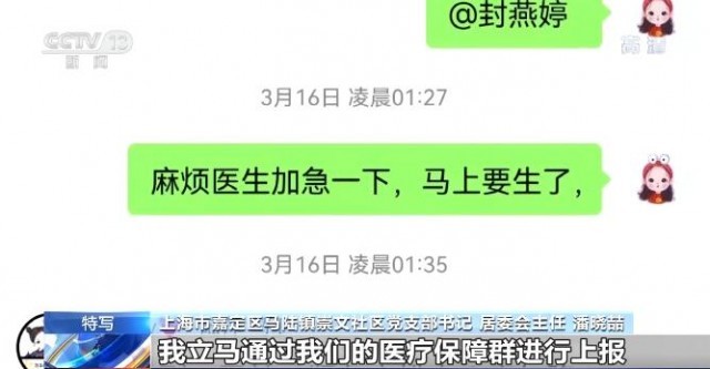上海市嘉定区玲珑坊小区居民 卫丹丹:之前潘主任也跟我讲过,她说你不管什么时候,只要发动了就马上联系我。我这个时候就让我老公给她拨了个微信语音过去,没想到她就是也接得很快,说马上就给我们安排120(救护车)过来,生的是男孩子,生出来是7斤7两。