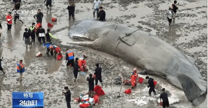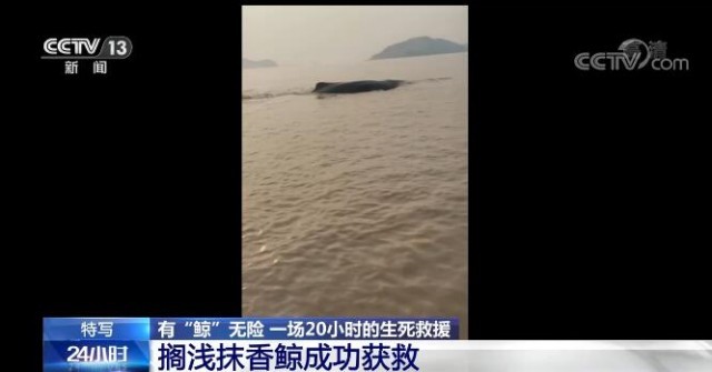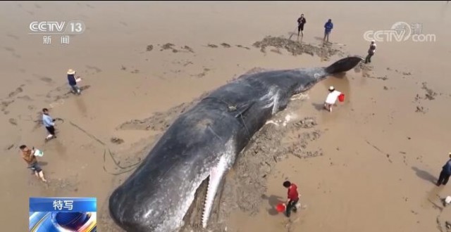 央视网消息:来聚焦一场"生死营救",救助的对象就是屏幕上的这个大家伙国家一级保护动物——抹香鲸。