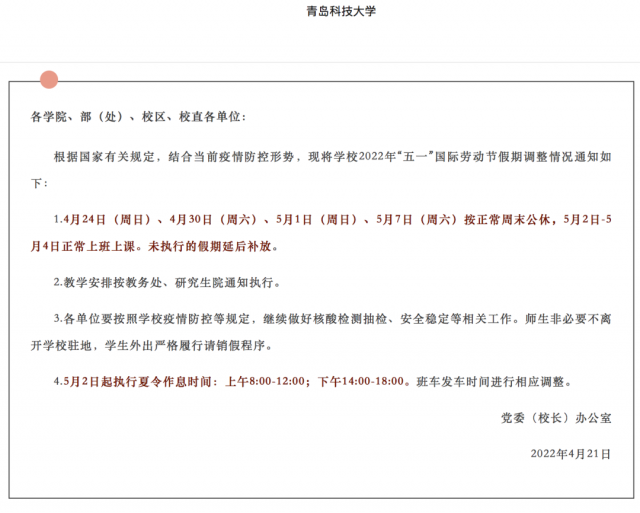 此外,青岛科技大学也明确,4月24日(周日)、4月30日(周六)、5月1日(周日)、5月7日(周六)按正常周末公休,5月2日-5月4日正常上班上课。未执行的假期延后补放。