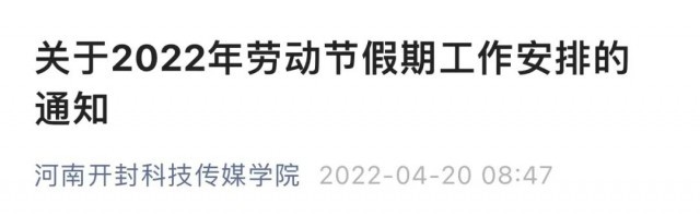 4月21日,中南林业科技大学发布《关于做好“五一”劳动节假期疫情防控工作的通知》。文中提到:4月22日至5月8日期间周一至周五正常上班、上课,周六、周日休息(具体教学安排由教务处、研究生院另行通知),“五一”劳动节法定节假日调整至暑假补休。